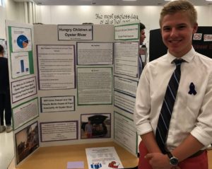 Instead of Final Exams at Oyster River High School in New Hampshire, ninth graders were able to participate in The Power of One program, an opportunity to organize a variety of charitable efforts. One student, Ty Mountain, chose End 68 Hours of Hunger-Oyster River for his project. Ty organized a food drive and collected over 600 items for the food pantry. Programs like this have students making a meaningful connection to their community and the world around them. Amazing work Ty!